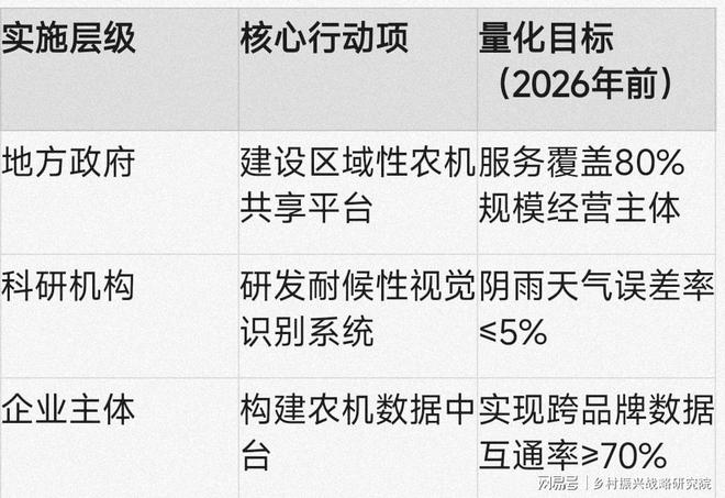 在资金配置方面,可参考国家农业科技园区模式,建立“中央奖补(最高1亿)+地方配套(3亿)+社会资本(15亿)”的资金池。在标准建设方面,制定《农机智能终端数据安全规范》,以破解60%农户担心的数据泄露问题。