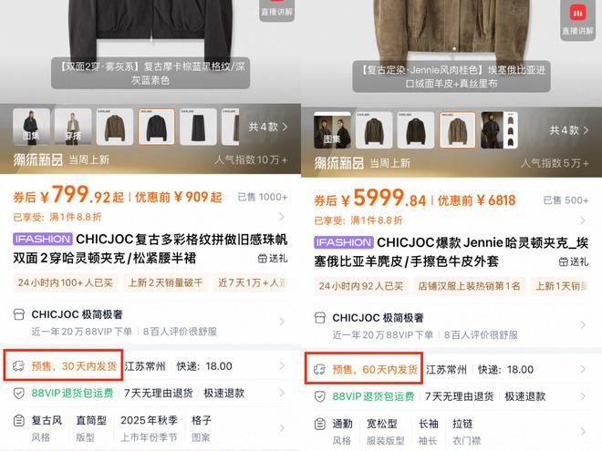 界面新闻在CHIC JOC淘宝店内看到,CHIC JOC近期上新产品仍有不少为预售,预售期短则一两周,长的甚至要等待30天或60天。