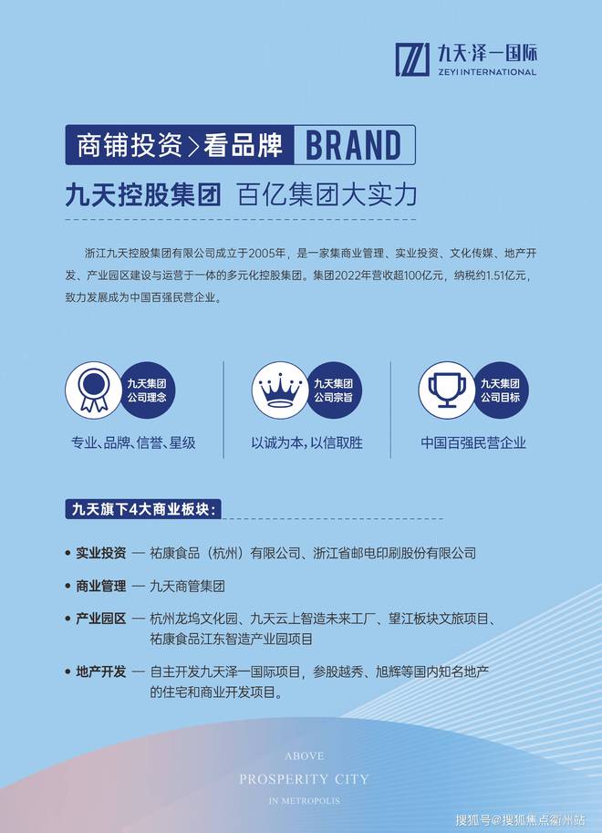 浙江九天控股集团有限公司成立于2005年,是一家集商业管理、实业投资、文化传媒、地产开发、产业园区建设与运营于一体的多元化控股集团。集团2022年营收超100亿元,纳税约1.51亿元致力发展成为中国百强民营企业。